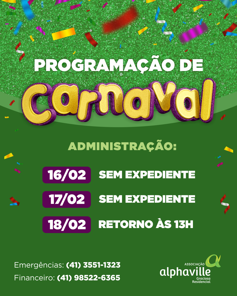 11 fev Programação de Carnaval ADMINISTRAÇÃO: 16/02 – SEM EXPEDIENTE; 17/02 – SEM EXPEDIENTE; 18/02 – RETORNO ÀS 13H. Emergências: (41) 3551-1323. Financeiro: (41) 98522-6365. Comments are closed. Recesso de Carnaval Older Entries